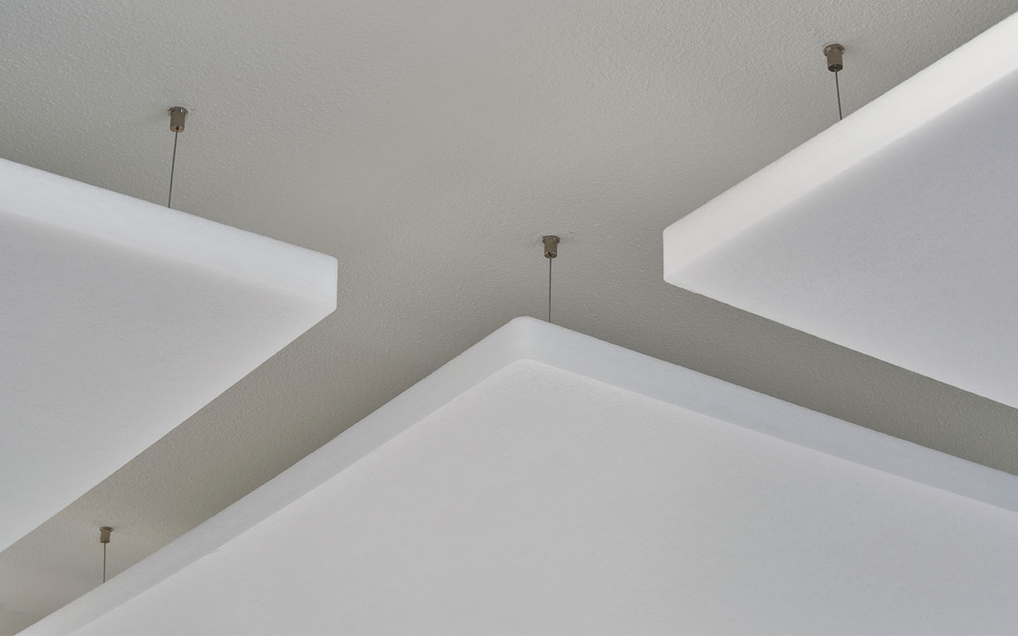 Om de akoestiek effectief te verbeteren is er door de klant gekozen voor de plafondpanelen Reducel Core. Deze panelen zijn gemaakt van 100% recyclebare polyesterwol en staan bekend om hun uitstekende geluidsabsorberende eigenschappen. Door de strakke en eenvoudige vormgeving sluiten de panelen moeiteloos aan op het bestaande interieur.